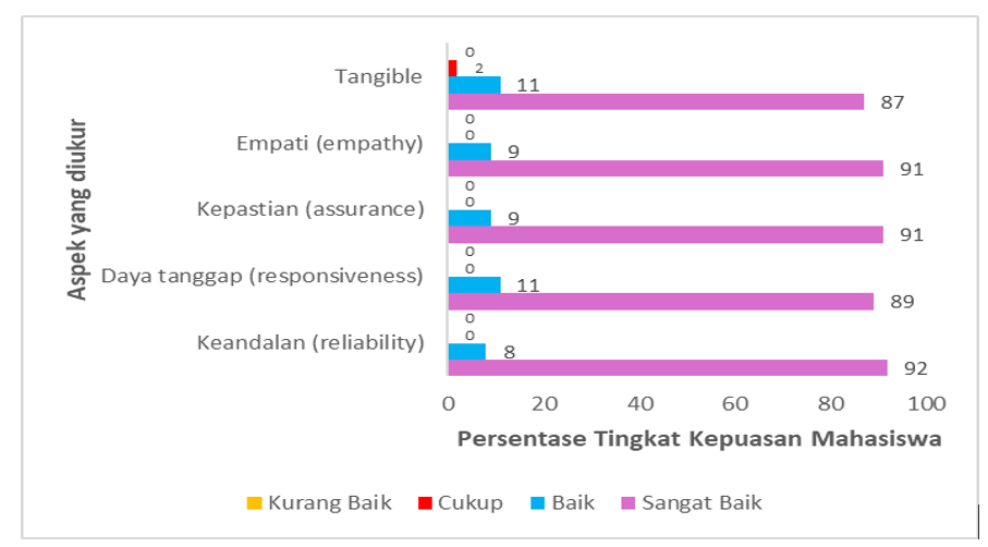 Berdasarkan data survei kepuasan mahasiswa terhadap performa dosen dan tenaga kependidikan, yang diukur melalui aspek “Keandalan“, “Daya tanggap“, “Kepastian“, dan “Empati“, menunjukkan hasil yang sangat memuaskan. Rata-rata 90,75% mahasiswa menyatakan “Sangat Baik” dan sekitar 9,25% menyatakan “Baik“, sehingga total kepuasan positif (Baik + Sangat Baik) mencapai 100%. Ini menunjukkan bahwa mahasiswa menilai dosen sangat andal, responsif, memberikan kepastian layanan, dan memiliki empati yang tinggi. Persentase tingkat kepuasan mahasiswa disajikan pada Gambar C-4.